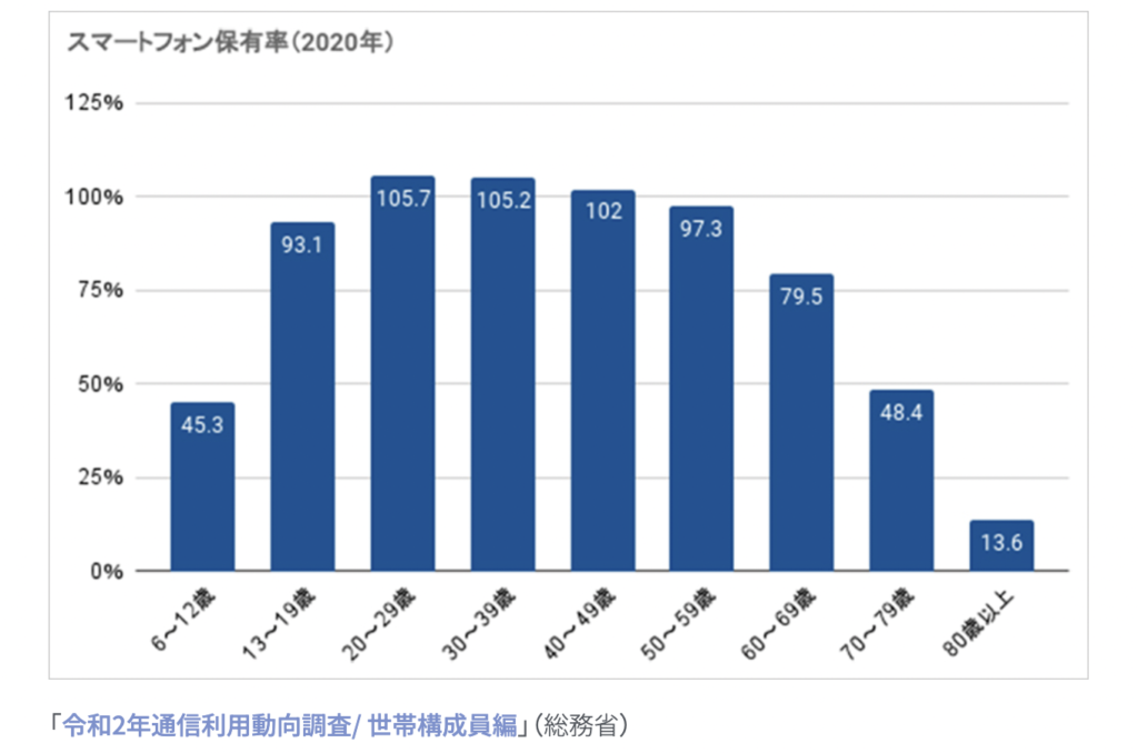 例えば、現在日本におけるスマートフォンの保有率は13~59歳で90%以上。