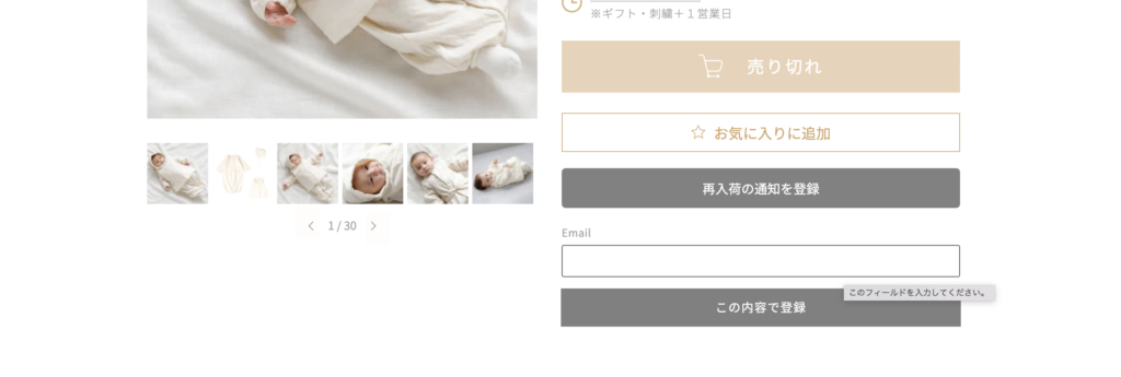 売り切れボタンの下に、再入荷お知らせボタンがあることにより購入熱が冷めないうちに購入までの導線をひくことが可能です。